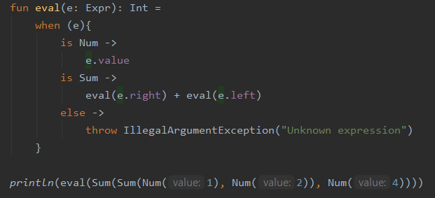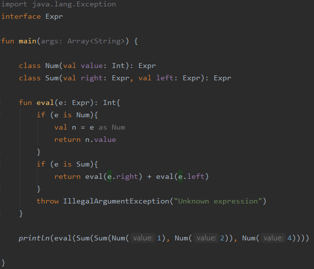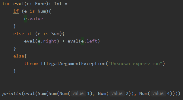 - 따라서 사실 'val n = e as Num'은 불필요함. eval(e.right)+eval(e.left)도 마찬가지로 스마트 캐스트가 쓰였음.