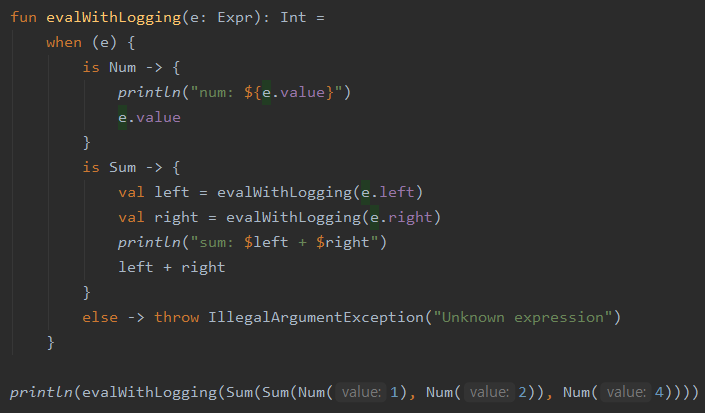 ☞ 이 경우 블록의 마지막 문장이 그 분기의 결과가 됨. (이는 분기에서의 블록, try ... catch에서의 블록, 람다의 블록에서도 쓰일 수 있음. 하지만 함수의 블록에서는 사용 불가능(반드시 return이 들어가야 함))