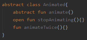 - stopAnimating 메소드, animateTwice 메소드: 추상클래스에 있더라도 추상 함수가 아니기 때문에 기본적으로 final 이지만 원한다면 open 변경자로 오버라이드를 허용할 수 있음.