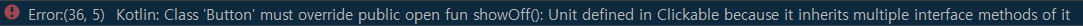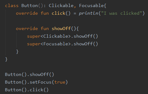 - 만약 두 인터페이스 중 하나만 호출해도 된다면 override fun showOff() = super<Clickable>.showOff() 이런식으로 작성하면 됨.