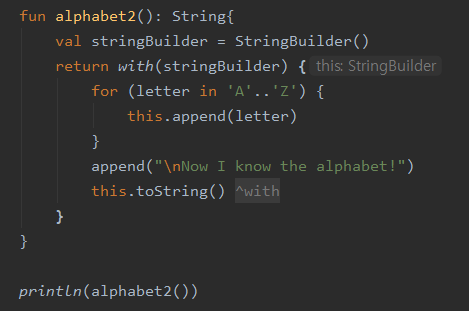 - return with(stringBuilder) 부분: 메소드를 호출하려는 수신 객체 지정
