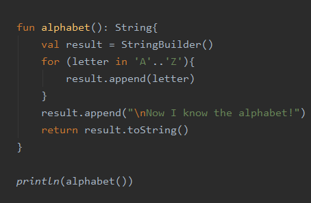 - append("\nNow I know the alphabet!") 부분: this를 생략하고 메소드 호출