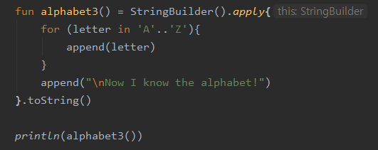 - 위 코드의 alphabet3 함수에서 apply를 실행한 결과: StringBuilder 객체 → 따라서 이 객체의 toString 메소드를 호출해서 String 객체를 얻을 수 있음.
