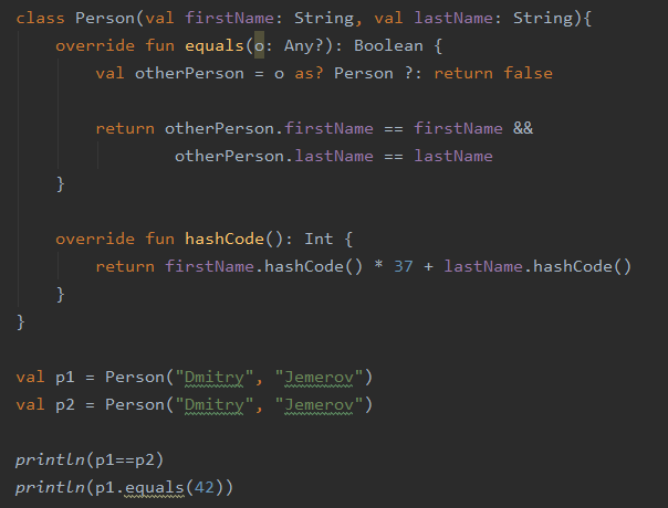 - val otherPerson = o as? Person ?: return false 부분: 타입이 일치하지 않으면 false 반환
