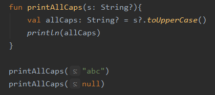 → 예를 들어, s?.toUpperCase()는 if (s!=null) s.toUpperCase() else null 과 같음