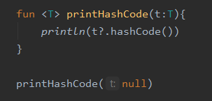 - println(t?.hashCode()) 부분: t가 널이 될 수 있으므로 ?.를 사용해서 안전한 호출을 해야 함