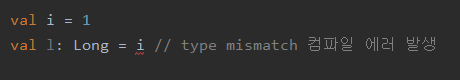 * 코틀린은 한 타입의 숫자를 다른 타입으로 자동 변환 해주지 않음