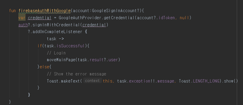 - 사용자가 성공적으로 로그인 했을 때 account(GoogleSignInAccount 객체)에서 ID토큰을 가져와서 firebase 사용자 인증정보로 교환함