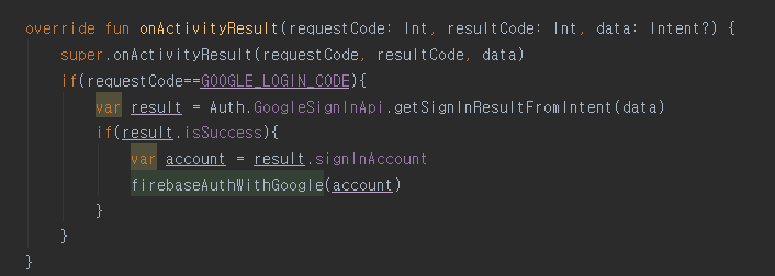 - result가 성공했을 때 이 값을 firebase에 넘겨주기 위해 account에 result의 signInAccount값을 저장한 후