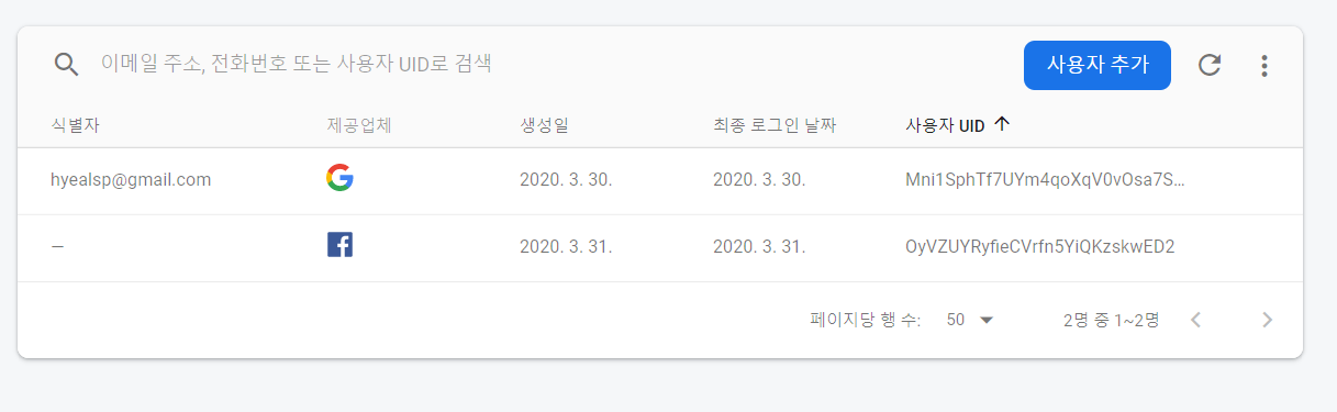 - 페이스북으로 로그인 하게 되면 다음 엑티비티로 넘어가게 되고, firebase에 아래와 같이 페이스북 계정이 추가됨