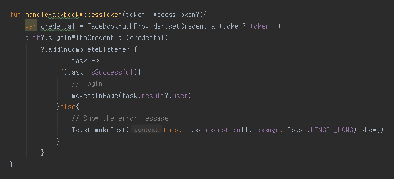 - handleFackbookAccessToken 메소드: 페이스북 데이터를 firebase에 넘기는 기능