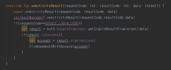- onActivityResult 메소드(콜백 함수)에 callbackManager.onActivityResult를 호출해서 로그인의 결과를 callbackManager를 통해 LoginManager에게 전달함