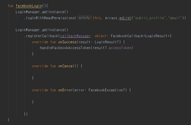 - 그 다음 object: FacebookCallback<LoginResult>는 최종적으로 로그인에 성공했을 때 나오는 부분임