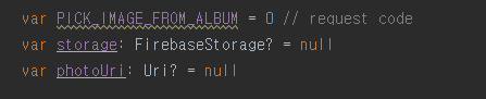 - storage: FirebaseStorage 타입의 변수
