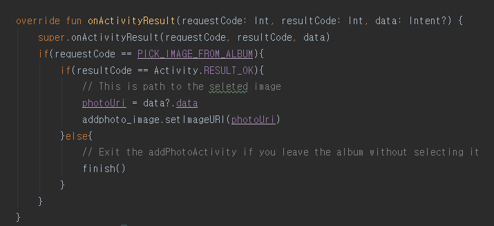 - requestCode가 PICK_IMAGE_FROM_ALBUM이고, resultCode가 액티비티가 성공했을 때(=사진을 선택했을 때) 이미지의 경로가 넘어오게됨.