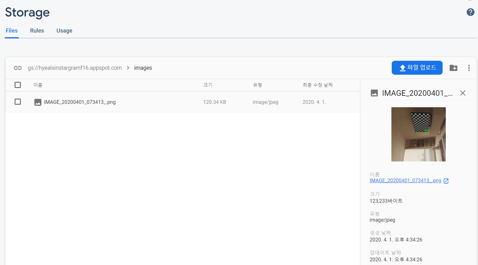 firebase의 storage에 들어가보면 성공적으로 사진이 업로드 됐음을 확인할 수 있음