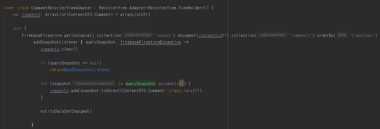 comments.add(snapshot.toObject(ContentDTO.Comment::class.java)!!)