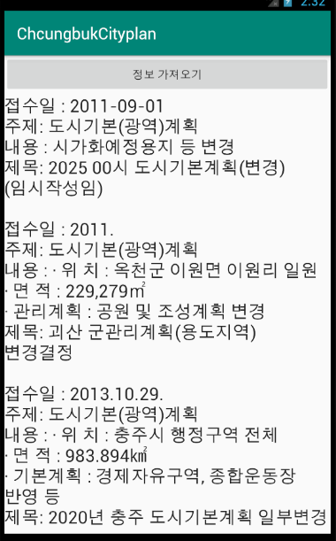 - 버튼을 누르면 아래와 같이 XML문서에 있는 데이터를 가져와서 출력함